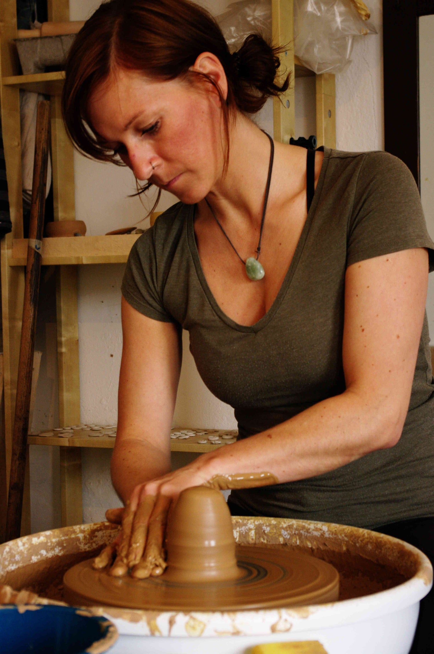 Ich sitze sehr gern an der Drehscheibe - für mich die pure Meditation. Auch wenn ich während des Drehens hochkonzentriert bin, denn eine einzig kleine Bewegung kann alles zerstören, kann ich meinen Gedanken freien Lauf lassen und entschleunigen. Gleichzeitig zentriert mich die Ruhe und bringt mich immer wieder in meine Mitte. Erdung.