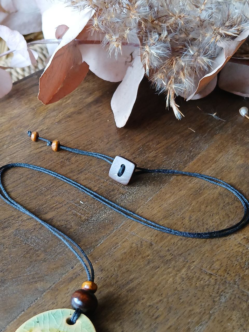 Zu verkaufen ist eine wunderschöne handgefertigte Halskette mit Keramikanhänger und Holzperlen verziert. Das Band (aus langjähriger Erfahrung sehr wasserresistent) der Halskette hat eine Länge von ca. 70 cm und ist größenverstellbar. So kann es schön auf Höhe des Hals- oder Kehlkopfchakras getragen werden.