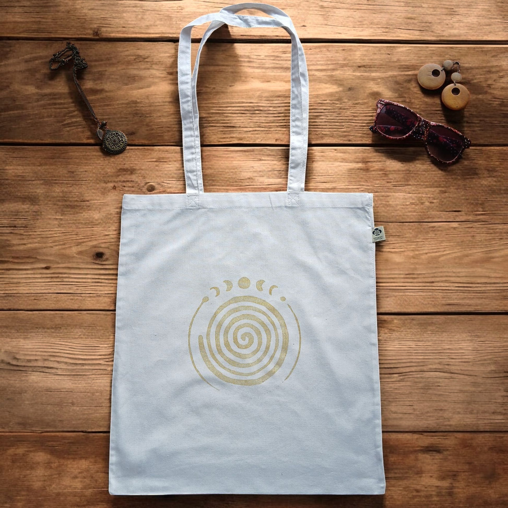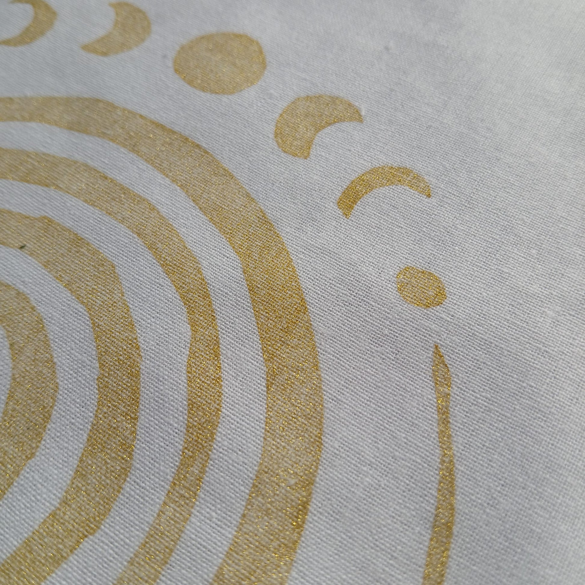 Handbedruckter Stoffbeutel via Siebdruckverfahren mit goldglänzender Effektfarbe. Der Beutel kann ganz normal bei 30 Grad gewaschen werden.