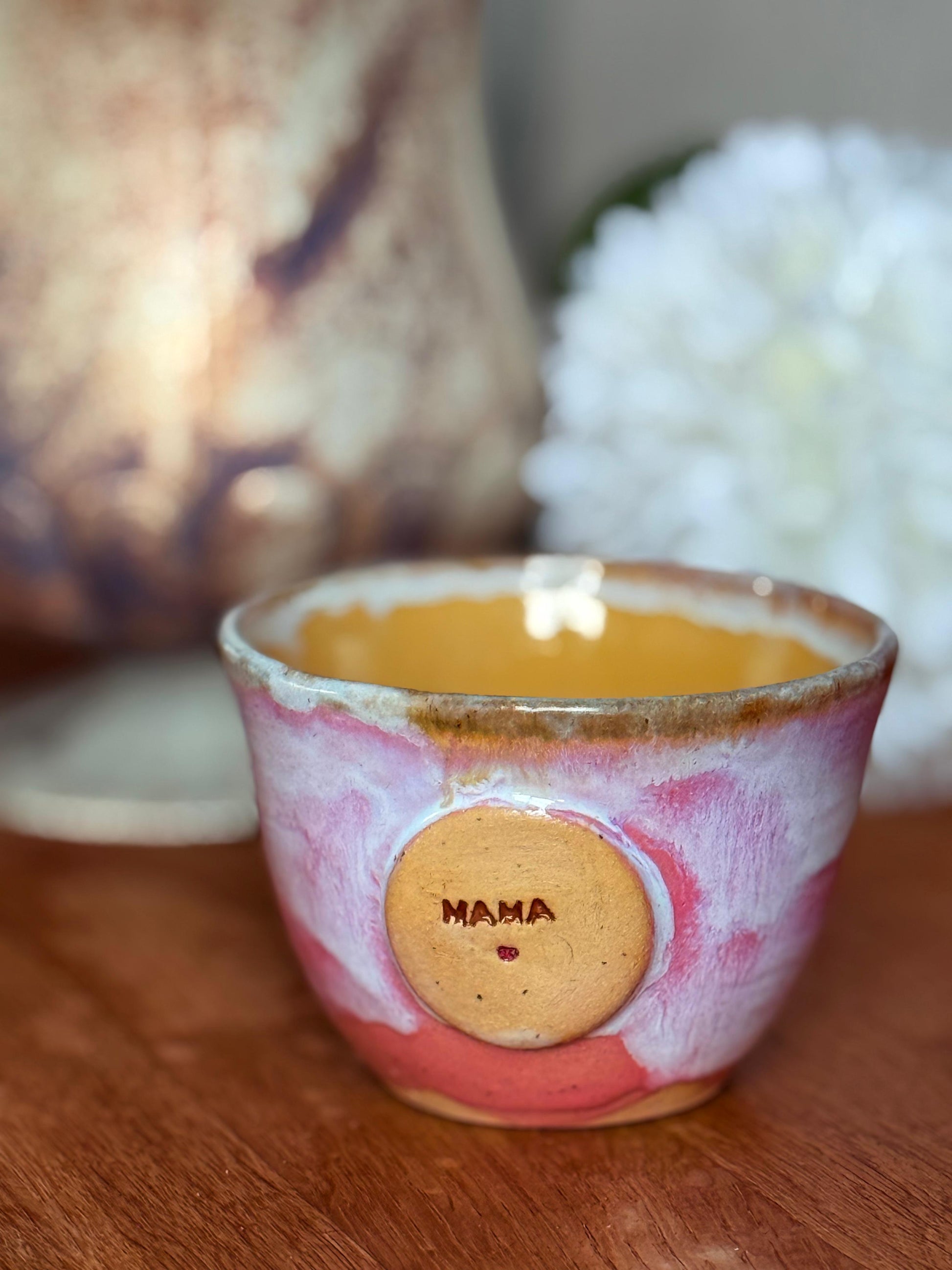 Zu verkaufen ist ein wunderschöner Keramikbecher, der mit insgesamt 5 verschiedenen Glasuren glasiert wurde. Ich wünsche Euch viel Freude damit!