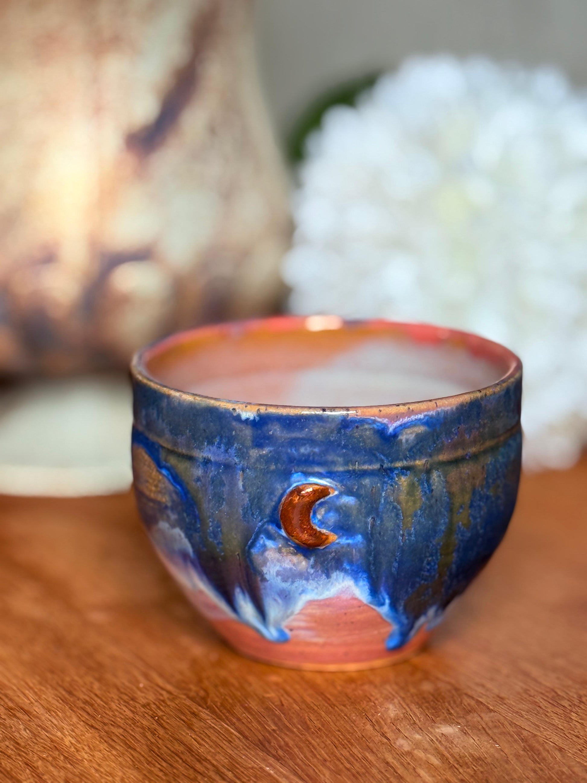 Zu verkaufen ist ein wunderschöner Keramikbecher, der mit insgesamt 5 verschiedenen Glasuren glasiert wurde. Ich wünsche Euch viel Freude damit!