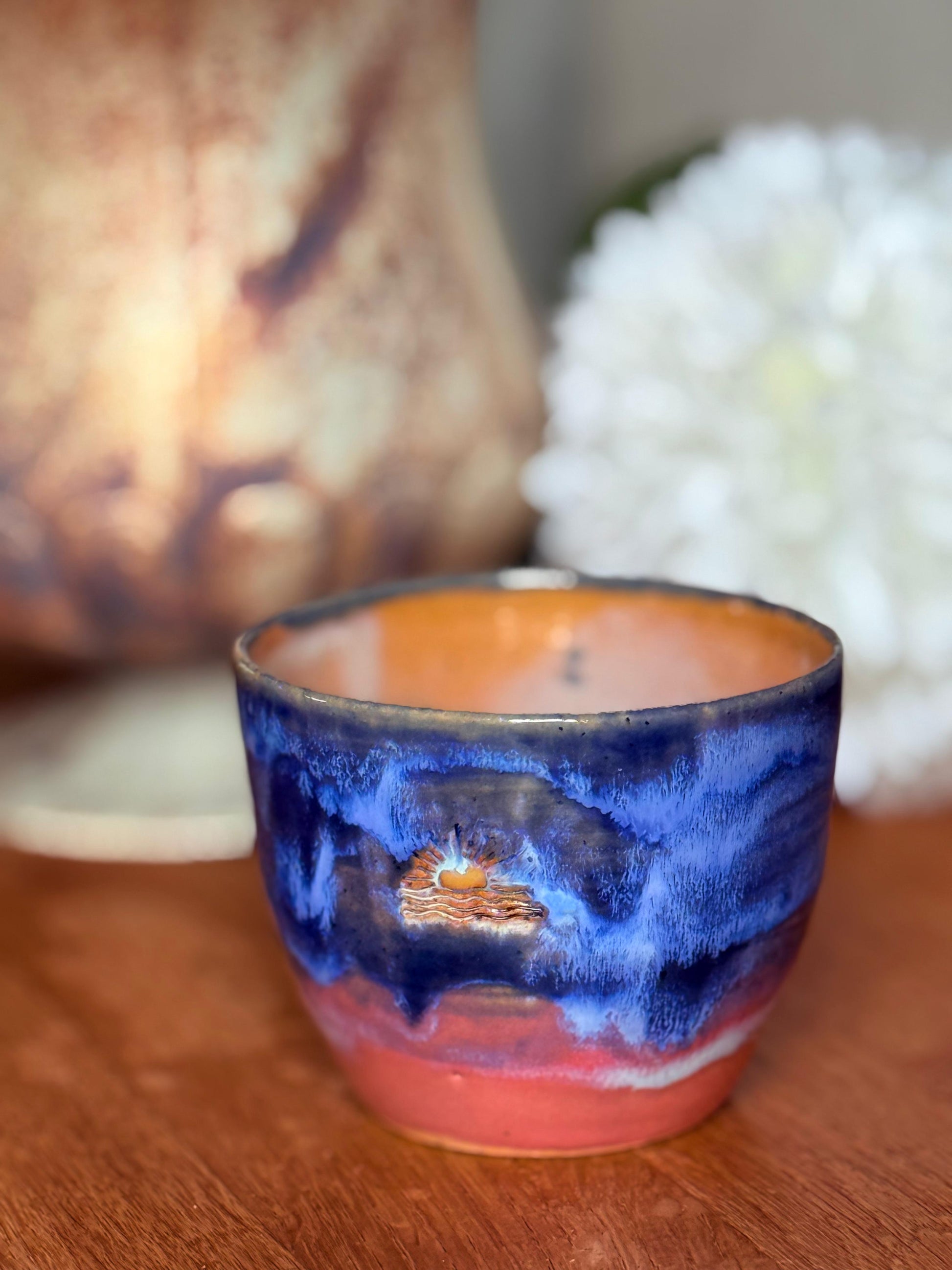 Zu verkaufen ist ein wunderschöner Keramikbecher, der mit insgesamt 5 verschiedenen Glasuren glasiert wurde. Ich wünsche Euch viel Freude damit!