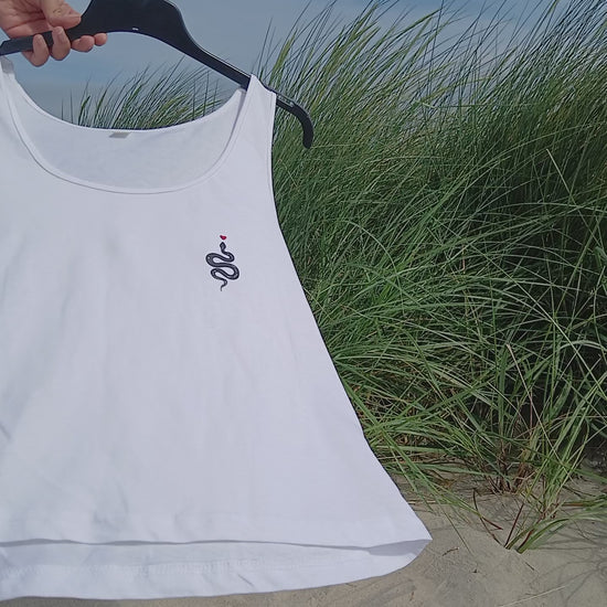 Das Tanktop besteht aus 100% Biobaumwolle und ist fairtrade gehandelt. Im Einkauf kostet es circa 9 Euro. Das Motiv ist handgezeichnet und anschließend auf Transferfolie gedruckt.